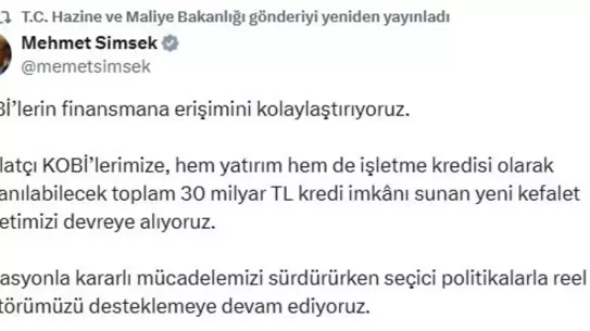 HAZİNE ve Maliye Bakanı Mehmet Şimşek, "İmalatçı KOBİ'lerimize, hem yatırım hem de işletme kredisi olarak kullanılabilecek toplam 30 milyar TL kredi imkanı sunan yeni kefalet paketimizi devreye alıyoruz" dedi.