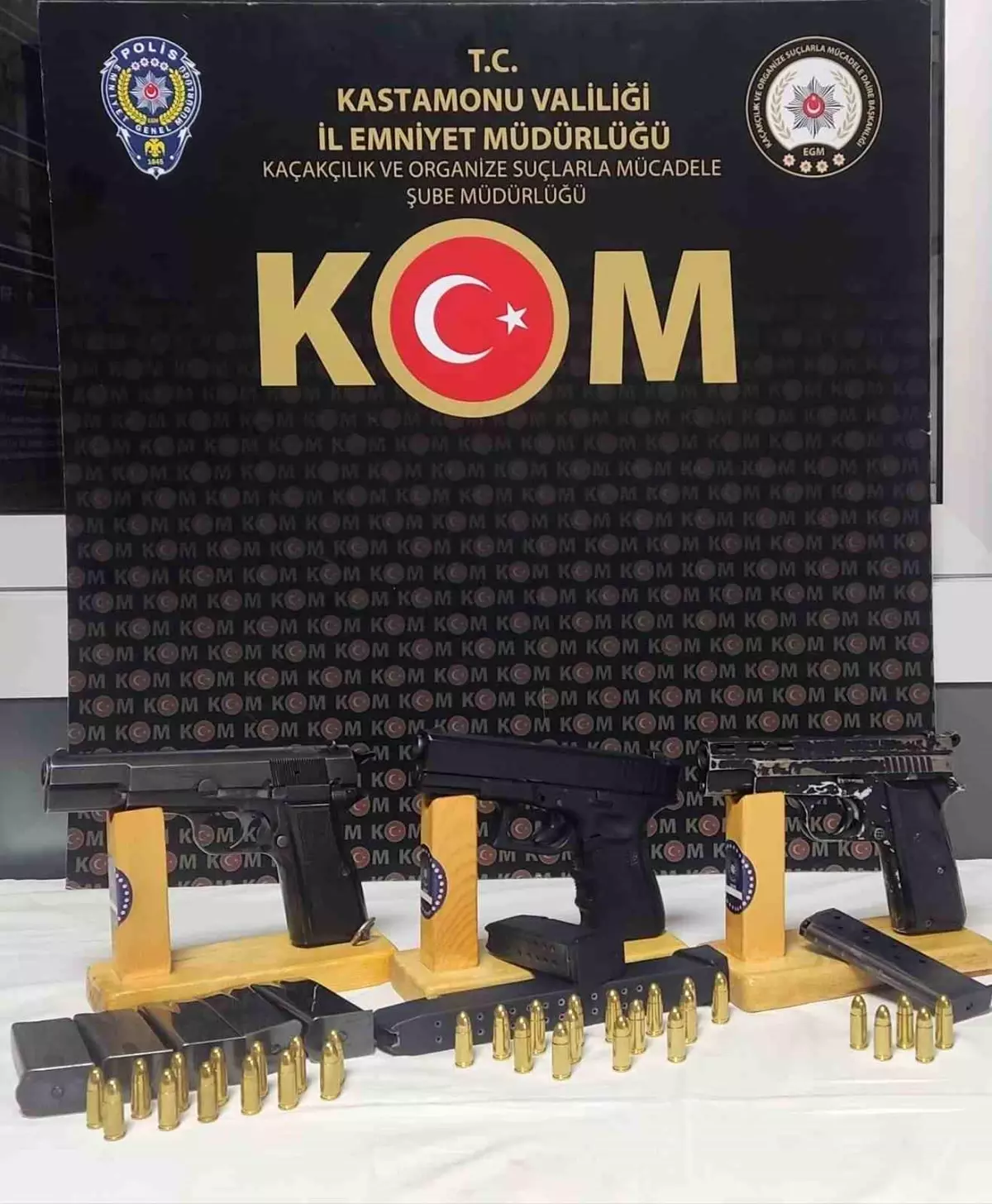 Edinilen bilgiye göre, Kastamonu İl Emniyet Müdürlüğü Kaçakçılık ve Organize Suçlarla Mücadele Şube Müdürlüğü ekiplerince il merkezi ve Taşköprü ilçesinde yapılan çalışmalar neticesinde 3 adet ruhsatsız tabanca, 8 adet şarjör ile 33 adet fişek ele geçirildi. Olayla ilgili yakalanan 4 şahıs hakkında adli işlem başlatıldı. - KASTAMONU