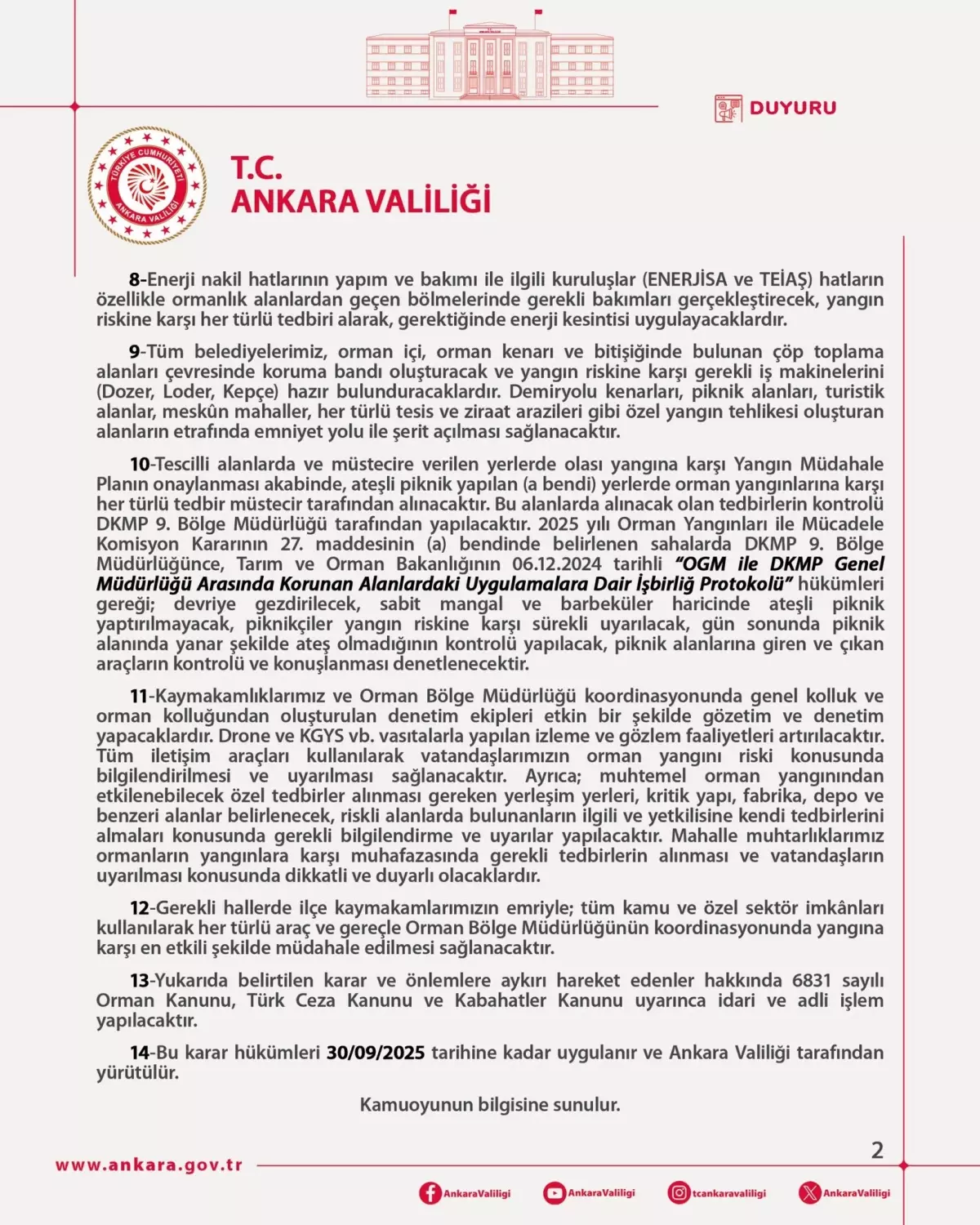 "Ankara il sınırları içerisindeki tüm ormanlık sahalara, Ankara Doğa Koruma ve Milli Parklar Bölge Müdürlüğünce sokak hayvanlarını beslemekle görevlendirilenler ve yetkili kamu görevlileri haricinde girilmesi yasaktır. Kamping işletmeleri haricinde ormanlık alanlarda kamp yapılmasına ve çadır kurulmasına izin verilmeyecektir. İlimizdeki ormanlarda yetkili idarelerin gözetim ve denetiminde bulunan mesire alanları, tabiat parkları ve milli parklarda; yukarıda belirtilen tarihler arasında, idarece belirlenen ocak, mangal, barbekü vb. düzenekleri olan yerlerde saat 09.00-20.00 arasında giriş çıkışlar yapılması serbest olup, bu sahalarda belirlenen saatler dışında her türlü giriş çıkış ve ateşli piknik ile kamp yapılmasına ve çadır kurulmasına izin verilmeyecektir. Ormancılık faaliyetlerinin gereği olarak üretim çalışmalarının devamı, fidan dikme bakım ve onarım gibi orman idaresinden ihale veya tahsisli sözleşmelerle iş almış kişiler ile bu çalışmaları denetleyen ve kontrol eden orman idaresi personelinin haricindeki vatandaşların ormanlara giriş ve çıkışları yasaklanmıştır. Orman Kanunu'nun 31 ve 32'nci maddesi kapsamında olan seyrek yerleşim yerleri/ mahalleler başta olmak üzere, orman içi, orman bitişiği ve ormanla ilişiği olmayan seyrek yerleşim yerleri/ mahalleler dahil olmak üzere anız, bağ bahçe ve tarla temizliğinden meydana gelen dalların ve her türlü bitki örtüsünün yakılması ve havai fişek atılması yasaktır."