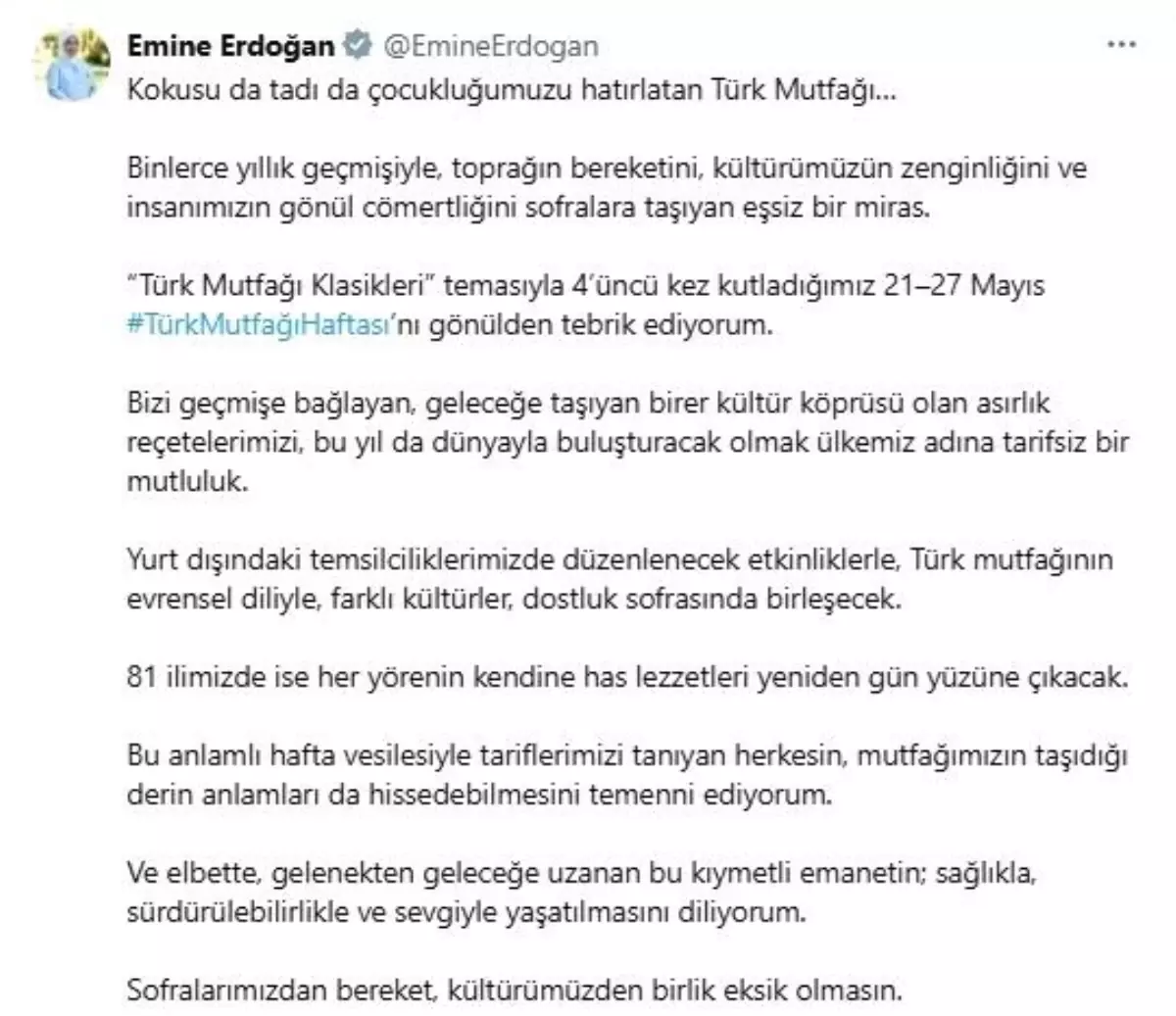 Emine Erdoğan, sosyal medya hesabından yaptığı paylaşımda, kokusu da, tadı da çocukluğu hatırlatan Türk mutfağının binlerce yıllık geçmişiyle toprağın bereketini, kültürün zenginliğini ve insanın gönül cömertliğini sofralara taşıyan eşsiz bir miras olduğunu belirtti. Erdoğan, paylaşımında şu ifadelere yer verdi: