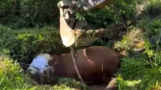 Rize'de bağını kopararak çay bahçesindeki çukura düşen kurbanlık boğa iş makinesi yardımıyla çıkarıldı.