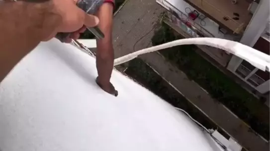 Antalya'da skandal bir olay yaşandı. 3 kişi, klima montajı yapmak için bir binanın çatısına çıktı. İşçilerden biri çatıdan baş aşağı sarkıp çalışmaya başladı.